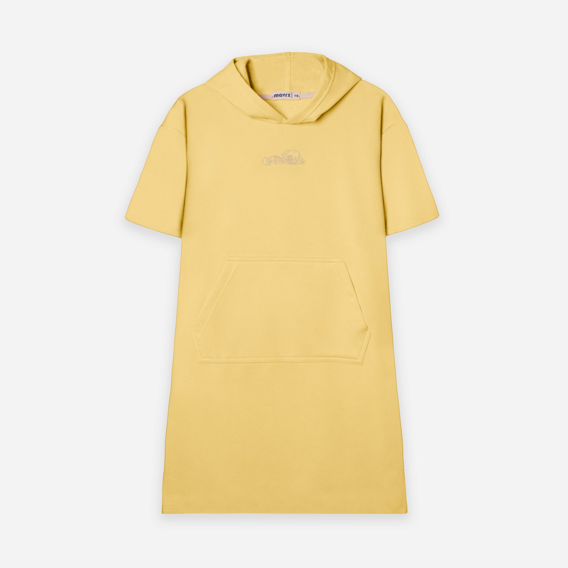 Short Sleeves hooded dress with front pouch pocket. Embossed print on the front. Label appliqué on the back..